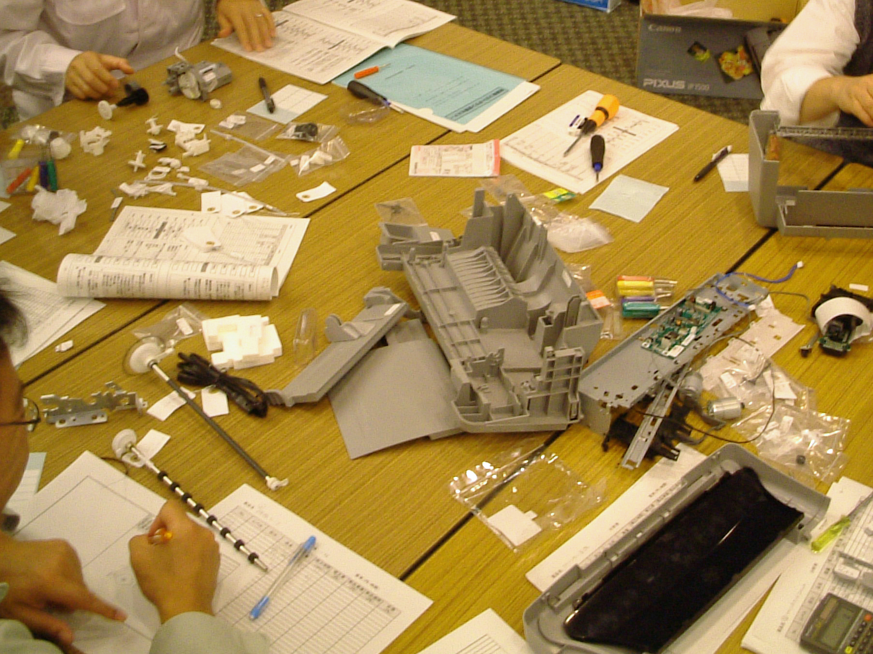 また「経営、開発、製造、購買、営業」を巻き込んだ全社的な活動が必要です。堀口は「半導体製造装置、自動車、電機機器」など22社で、自社製品や市販製品をリバースエンジニアリングしながら設計変更案(VE案)を見つける「参加型研修」で原価企画の導入を進めてきました(研修風景)。 |